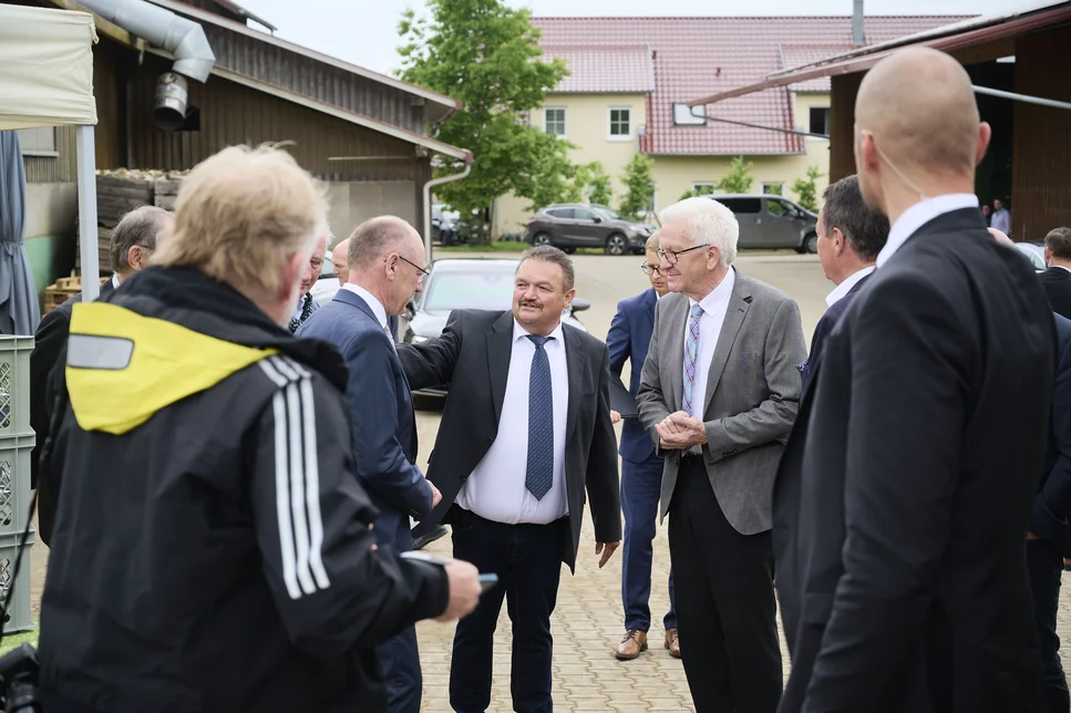 Familie Bernhard und Ministerpräsident Winfried Kretschmann bei der Einweihung ihrer Anlage am 13. Mai 2022.
