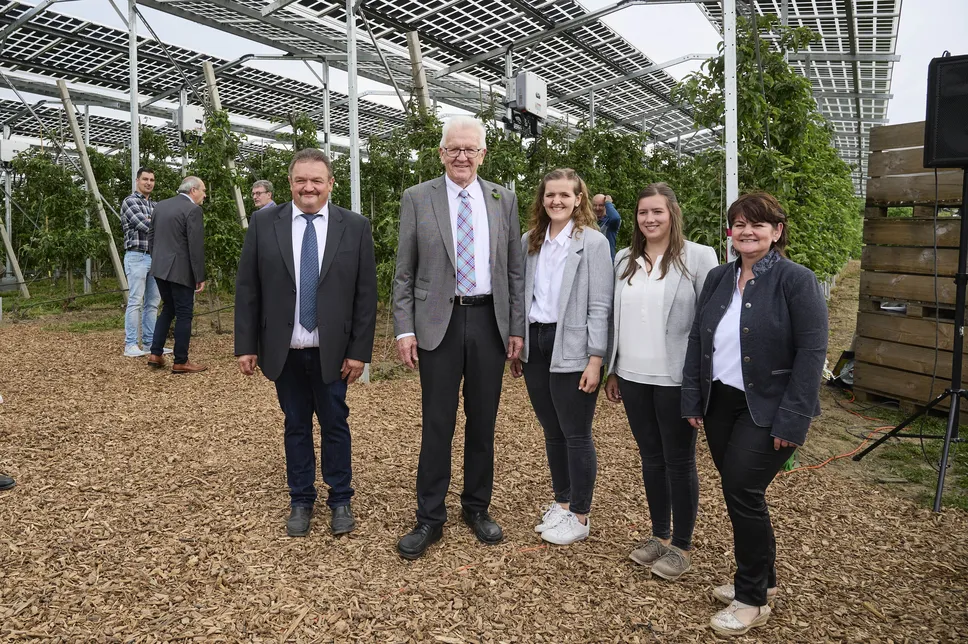 Ministerpräsident Winfried Kretschmann, Landwirt Hubert Bernhard und Leiter des Fraunhofer-Instituts für Solare Energiesysteme ISE Andreas Bett eröffnen die Agri-PV-Anlage in Kressbronn.