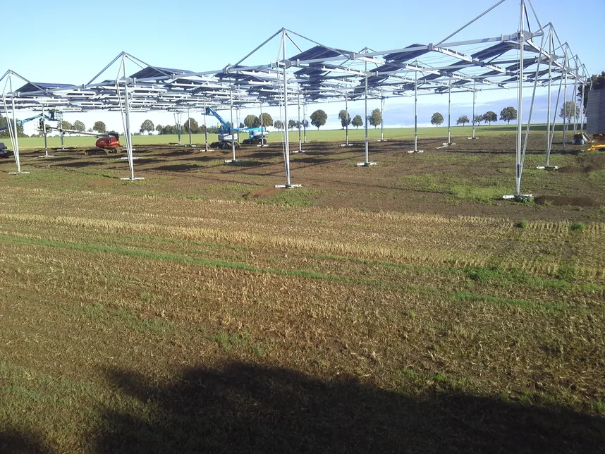 Die Anlage zeichnet sich durch ihr besonders innovatives Design aus. Die Modultragrahmen sind in einer von Ost nach West ansteigenden Treppenstruktur angeordnet und innerhalb der Modulfelder variabel positionierbar. Dadurch lassen sich unterschiedlichste Beschattungsvarianten experimentell erproben. Jeder Rahmen nimmt acht querliegende, bifaziale PV-Module mit je 455 Watt auf. Insgesamt werden dadurch 30 Prozent des Solarfelds verschattet.