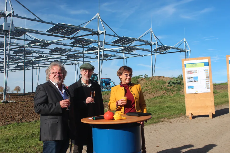 Ministerpräsident Winfried Kretschmann, Landwirt Hubert Bernhard und Leiter des Fraunhofer-Instituts für Solare Energiesysteme ISE Andreas Bett eröffnen die Agri-PV-Anlage in Kressbronn.